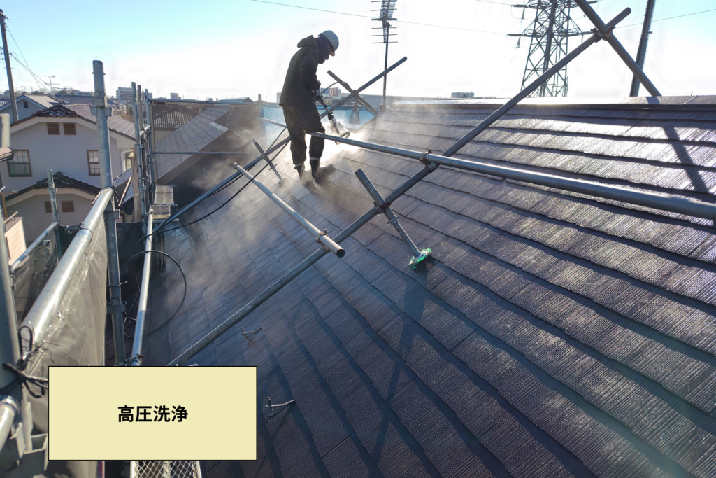 作業安全面を確保しつつ、はじめに屋根の洗浄を行います。見た目は大丈夫そうでも、目には見えにくい経年によるホコリや汚れは堆積しているので、しっかりと洗浄していきます。この作業で塗装の仕上がりにも大きく影響してきますので、非常に重要な工程となります。