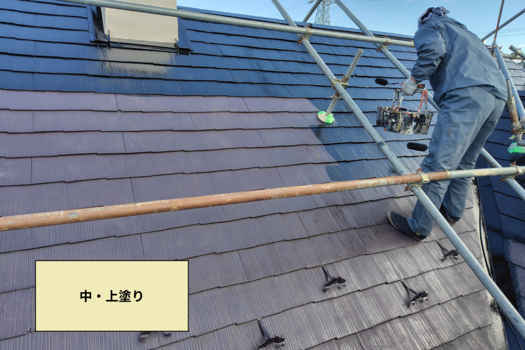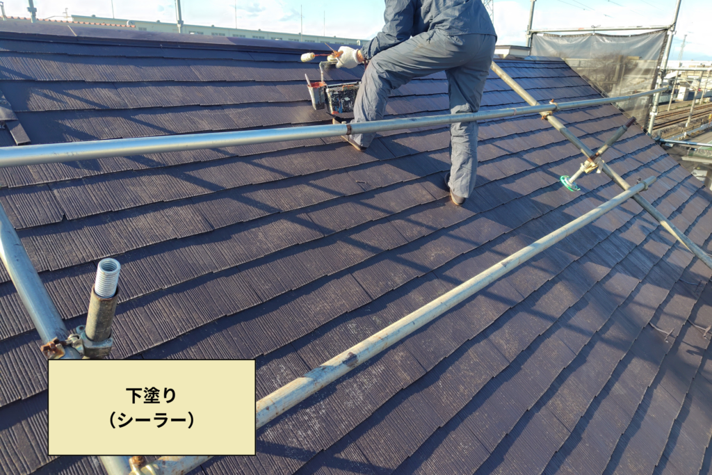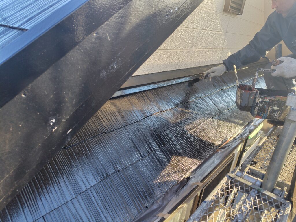 外壁と違い、屋根は常に風雨に晒されていたり、紫外線の影響などを受けている為、かなりのダメージを受けています。次の工程である中塗り・上塗りとの密着性を高めるため、2液性のものを使用するようにします。早々に剥がれてしまっては元も子もないですからね。