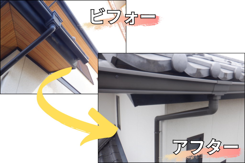 お客様より、「雨が降るたびに、雨樋から雨水がバシャバシャ落ちてくる」とのお問い合わせをいただきました。