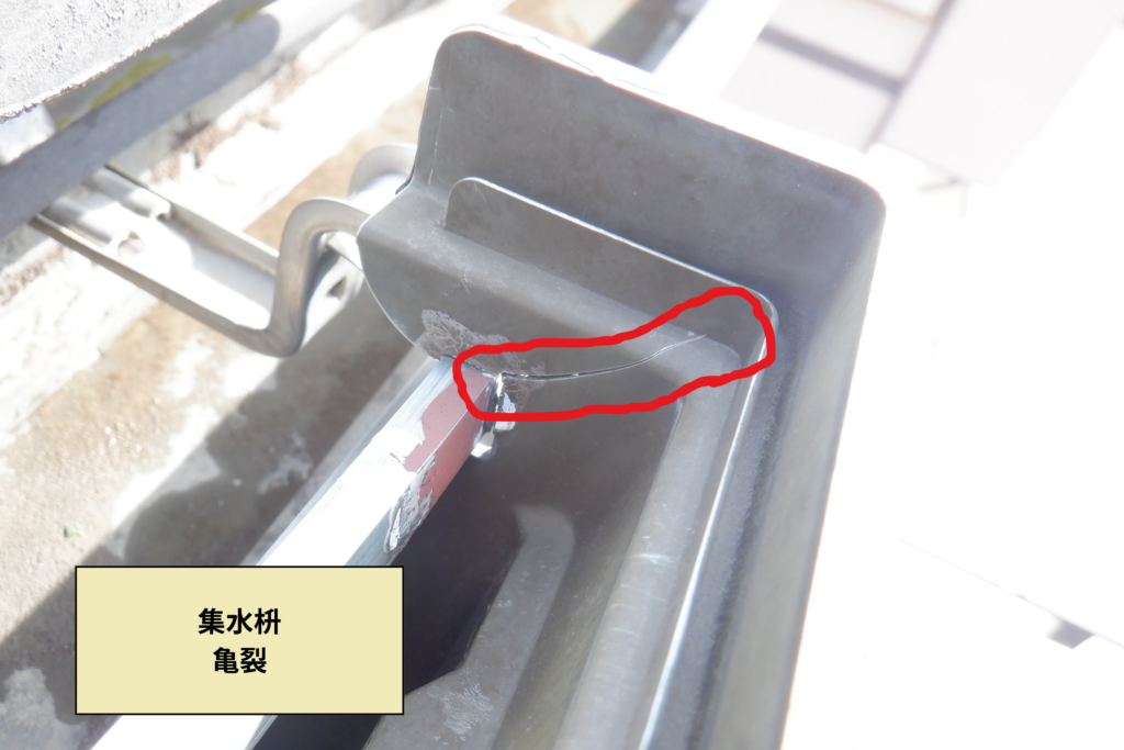 間近で確認してみると、雨樋に亀裂が入っているのが分かります。確かにこれではひと雨降るごとに漏れてしまうのも無理もないでしょう。考えられる原因としては、過去に塗装工事を行い、もっとも熱伝導率の高い黒系の塗料で塗装してある事と、この位置は、西日が当たりやすく、そういった条件が重なり、寒暖差による雨樋の自然伸縮が原因で、亀裂が入ってしまったのではと考察します。残念な事に、こちらの製品は、冒頭でもお伝えしたように、既に廃盤品となっており、部分的な交換等が出来ないのです。