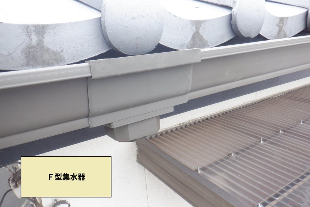 オークブラウンの場合、既設品と同じ角集水器の規格そのものが無く、今回はF型集水器を採用しました。軒樋と一体感があり、スッキリした仕上がりとなります。こちらはこちらで、角集水器には無いスマートさがありますね。